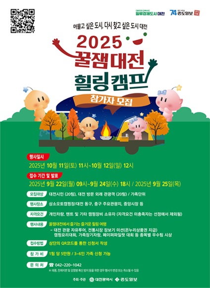 한편, 대전시는 같은 달 ‘2025 꿀잼대전 힐링캠프’를 통해 지역 관광 활성화에도 나서며 상소동 오토캠핑장에는 40가족이 참여하는 숙박형 체험 프로그램으로, 관광과 캠핑을 결합한 체류형 관광 모델을 선보인다.